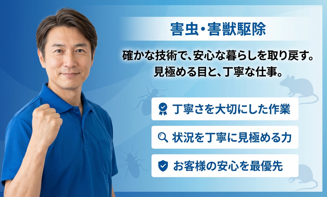 調査では侵入経路を細かく探り、ベイト剤と隙間封鎖の併用措置を提案されました。作業中は薬剤の作用や衛生管理の仕方を具体的に説明してもらい、納得して進められました。ただ、報告書の言い回しが少し専門的だったため、もう少しかみ砕いて説明していただけるとより分かりやすかったです。