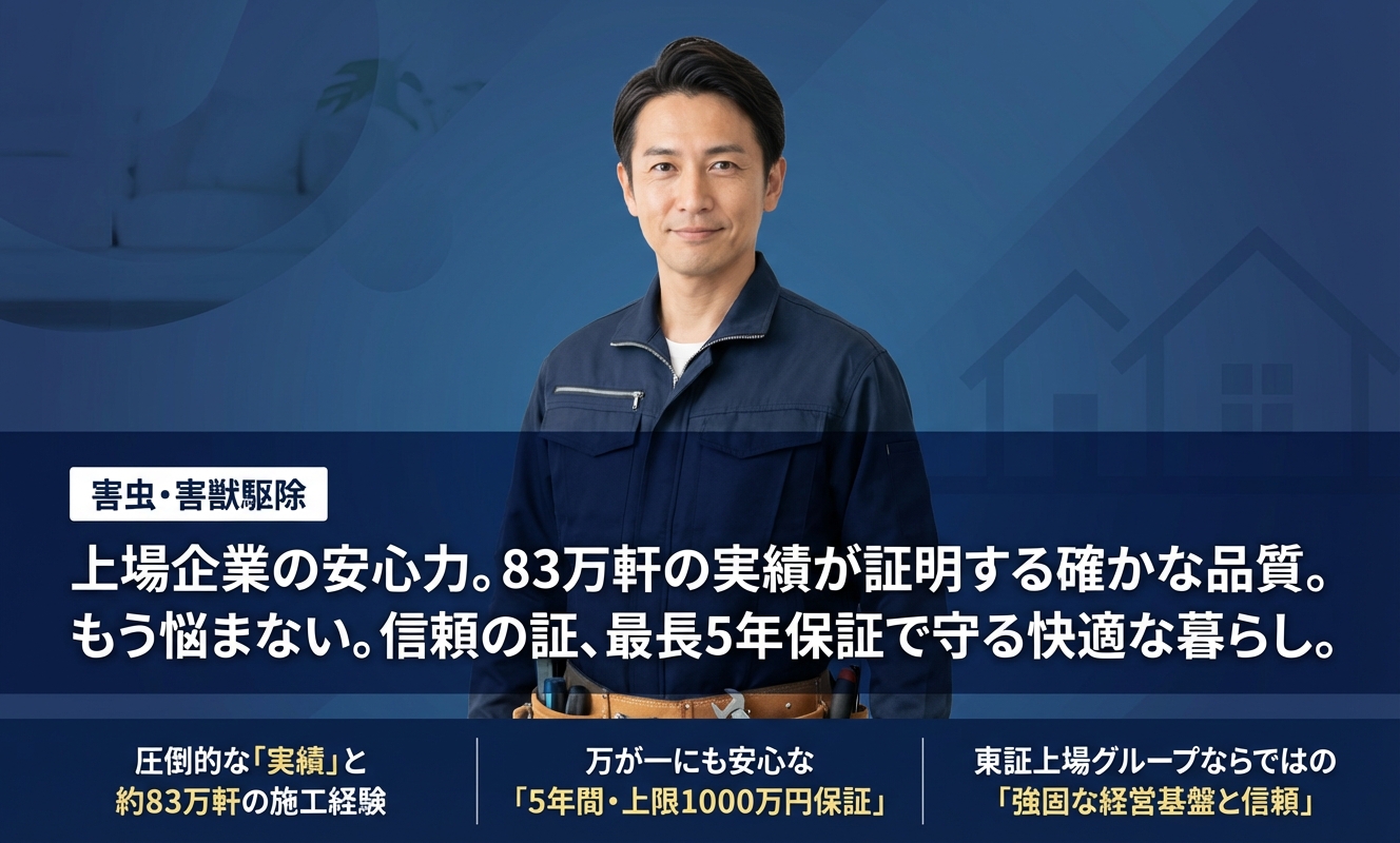 サニックスの最大の強みは、約83万軒という圧倒的な施工実績と、東証上場グループの安心感です。無料の床下調査で予防を重視したサービスを提供し、さらに充実した5年間・上限1000万円の保証と年1回の無料点検により、長期間にわたって住まいを守ります。土曜・祝日も調査可能で、ご相談しやすい体制も整っています。