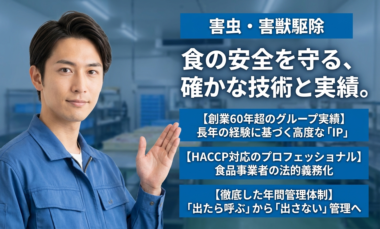 半世紀以上の歴史を持つ太洋化工グループの一員として、特に「食の安全」に関わる防除において圧倒的な信頼を得ている業者です。HACCPの完全義務化にもいち早く対応し、薬剤に頼りすぎない環境配慮型の施工を徹底しています。一時的な駆除ではなく、定期点検とモニタリングを通じて「害虫を発生させない環境」を構築することに長けており、コンプライアンスや衛生意識の高い施設オーナー様から高く評価されています。
